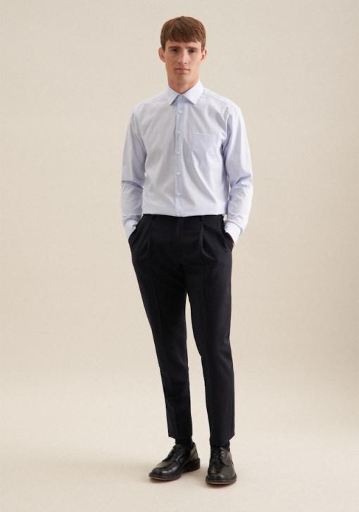 Regular Form, maskuline Ästhetik: Sorgen Sie für ein stilvolles Erscheinungsbild mit dem Regular Business Hemd von Seidensticker aus der „SMART ESSENTIALS“ Kollektion. Ob Freizeit, Büro, Veranstaltungen oder Homeoffice – es ist ein eleganter Begleiter, der durch schlichte Eleganz überzeugt. Popeline wird mit hoher Dichte gewebt und ergibt daher ein extrem widerstandsfähiges Material. In Kombination mit 100% Baumwolle ist es bestens geeignet für pflegeleichte Business-Outfits. Im klassisch-geraden Regular Schnitt bietet das Business Hemd hohen Tragekomfort und liegt weniger eng an. Das schicke Streifen-Muster ist eine stilvolle Ergänzung. Smarte Modernität mit formellen und legeren Aspekten prägt dieses Hemd von Seidensticker. Bei diesem Langarm-Business Hemd werden Stil und Eleganz besonders hervorgehoben. Weitenverstellbare Manschetten runden das Gesamtbild ab. Ein Kentkragen unterstreicht den universellen Business-Charakter. Außerdem ist eine Brusttasche aufgenäht worden. Dieses Business Hemd erfüllt unsere eigenen hohen Anforderungen an unsere Produkte in Bezug auf nachhaltige Rohstoff-Verwendung, verantwortungsvolle Herstellung und plastikfreie Verpackung. So übernehmen wir soziale Verantwortung.